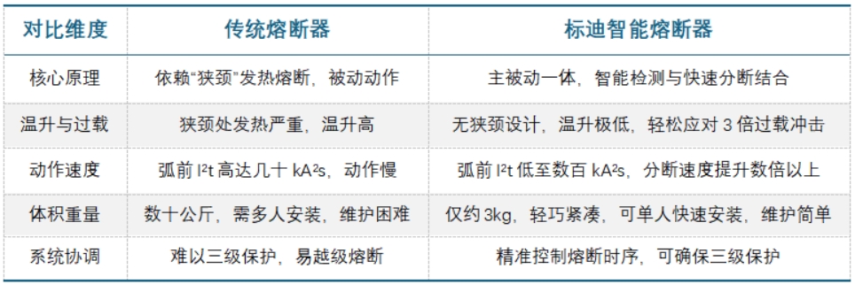 标迪电子智能熔断器,不仅一举攻克了储能系统三级协同保护的行业性难题,更彻底解决了熔断器领域长期存在的“低温升”与“快分断”不可兼得的核心矛盾。